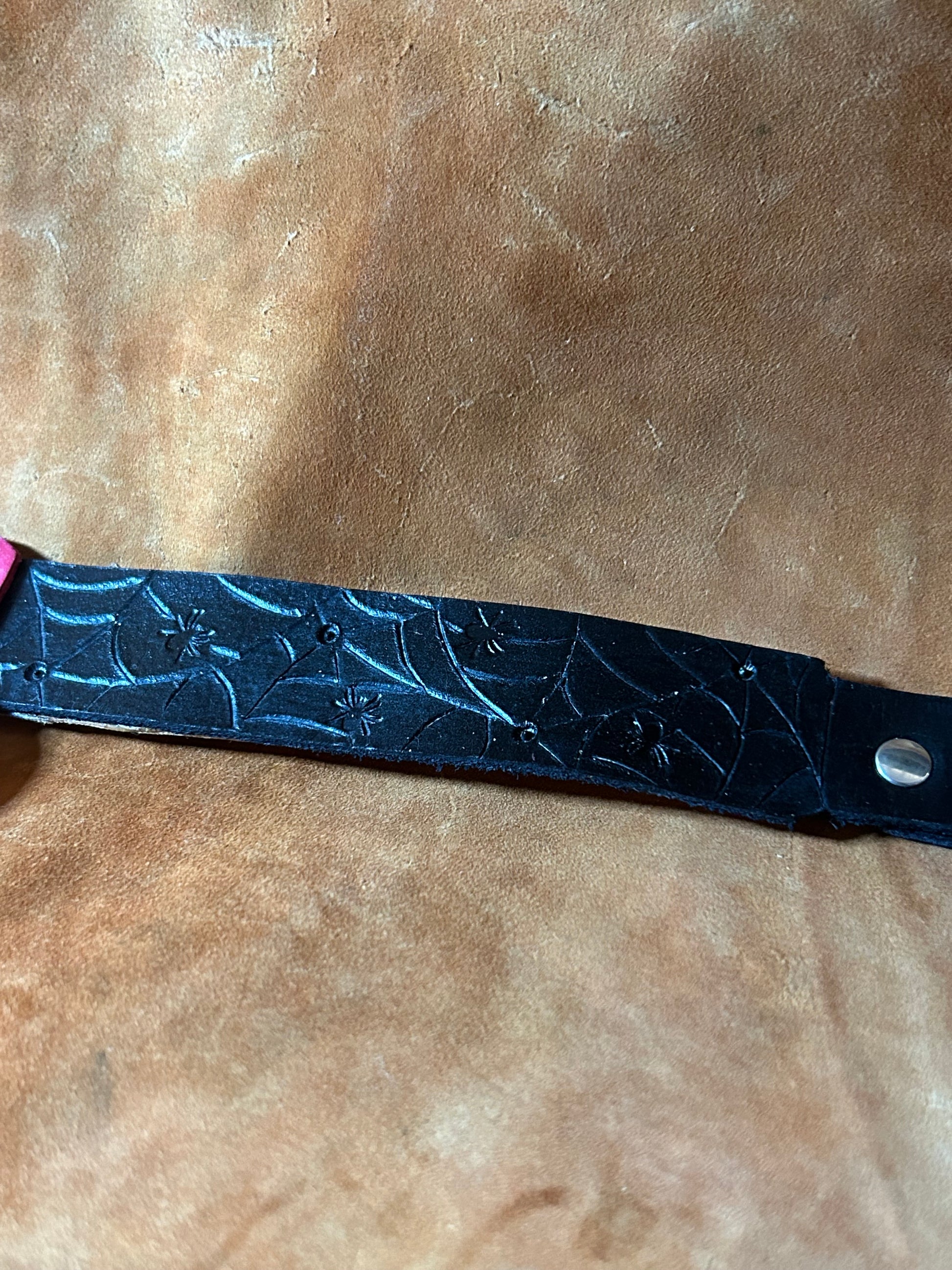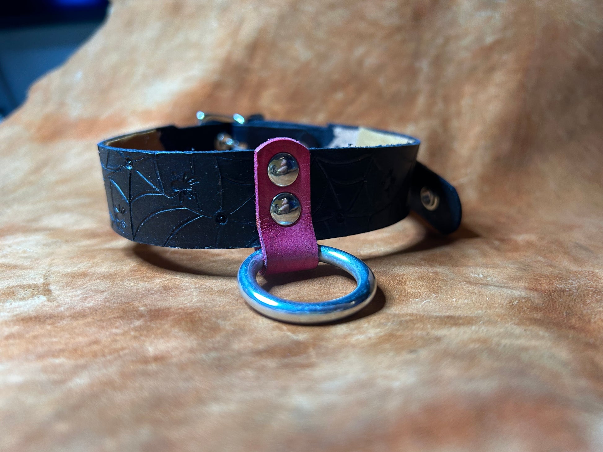 1” wide collar with hand-tooled spider web pattern and o-ring.